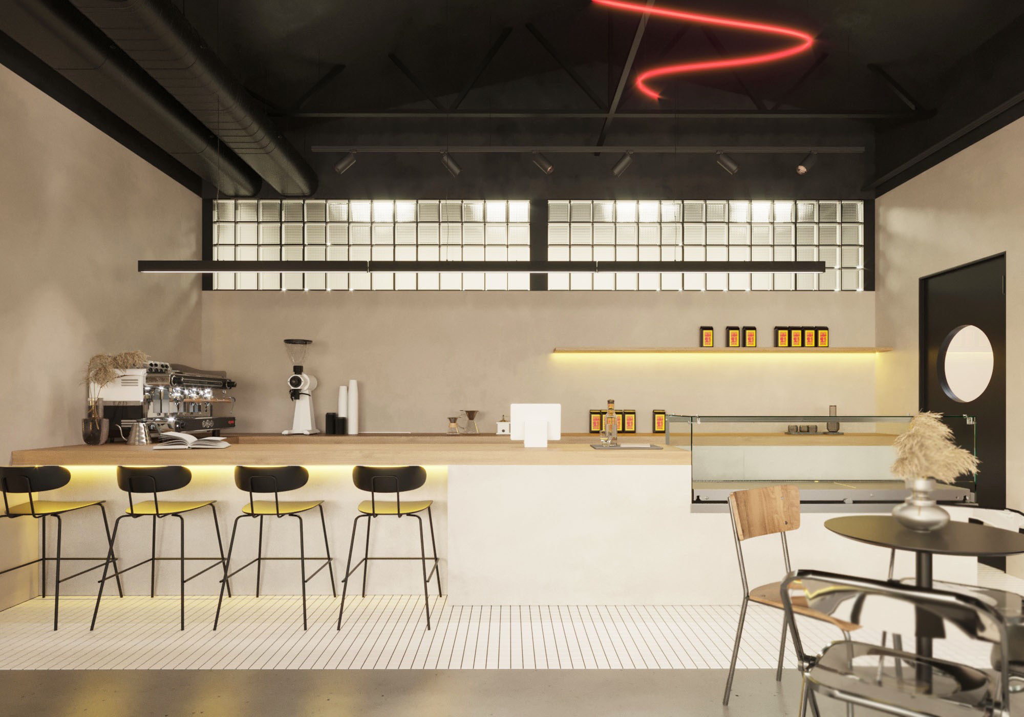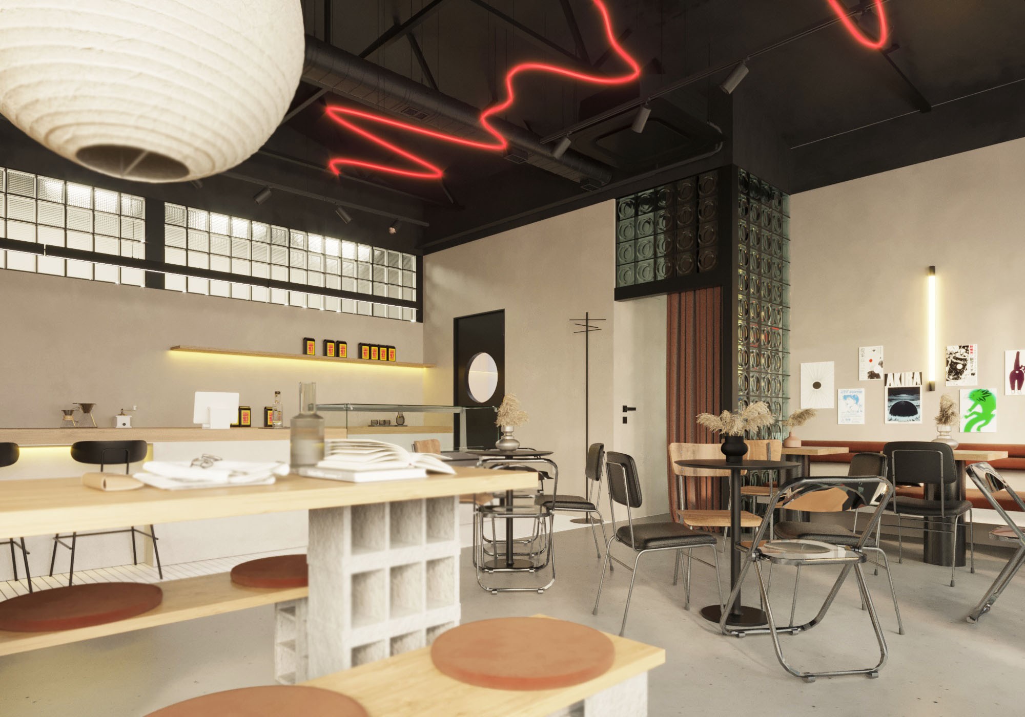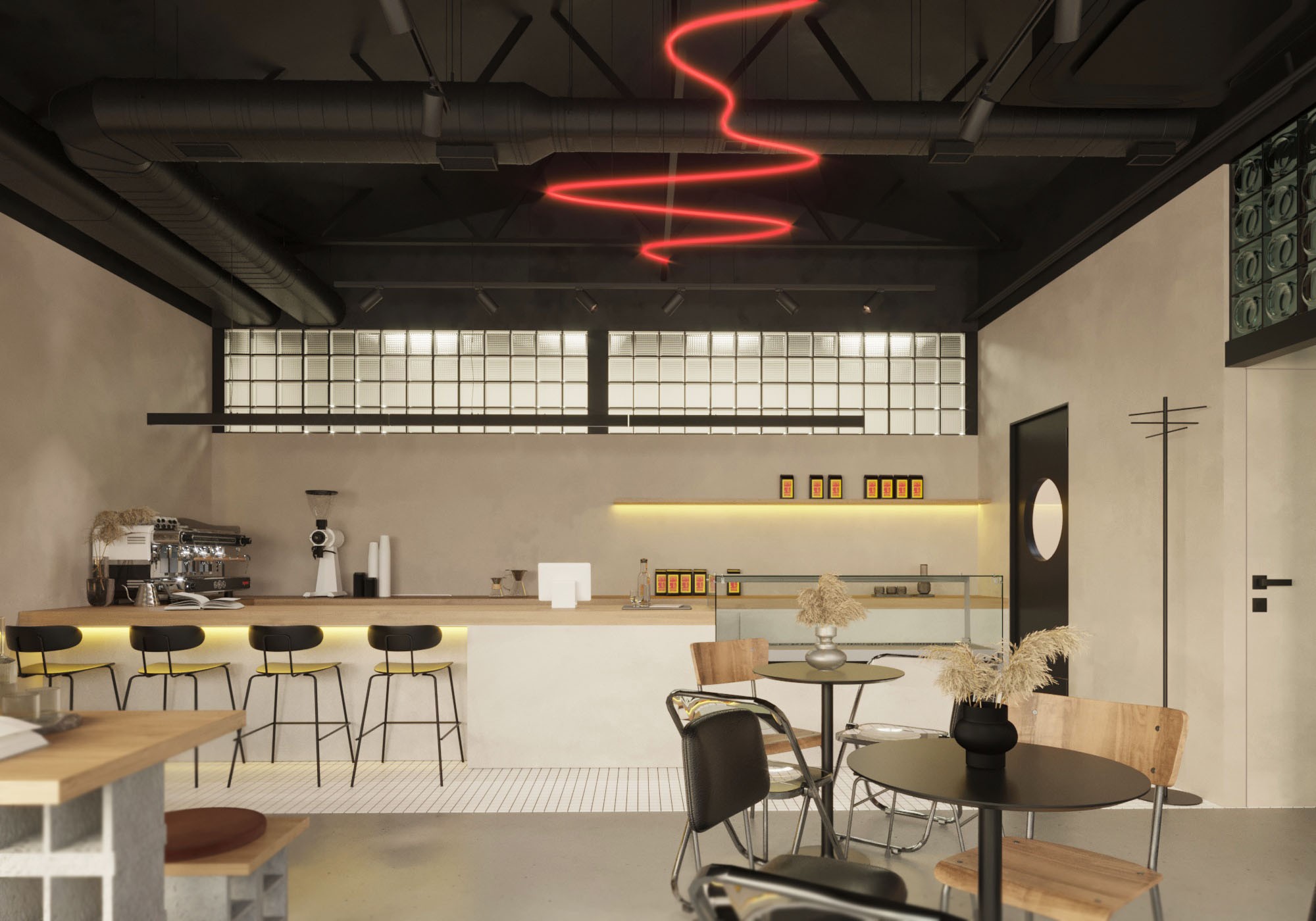 The interior details also had a reference to the name "on fire", so the interior features red color in the form of lighting and accent fabric. The LED chandelier is made in an abstract form that resembles a stream of spreading lava. At the same time, it was decided to leave the walls and floor neutral in order to reduce visual noise, because the area where the coffee shop is located is characterized by many self-built buildings and an excessive amount of advertising and signage, that do not have a consistent style.