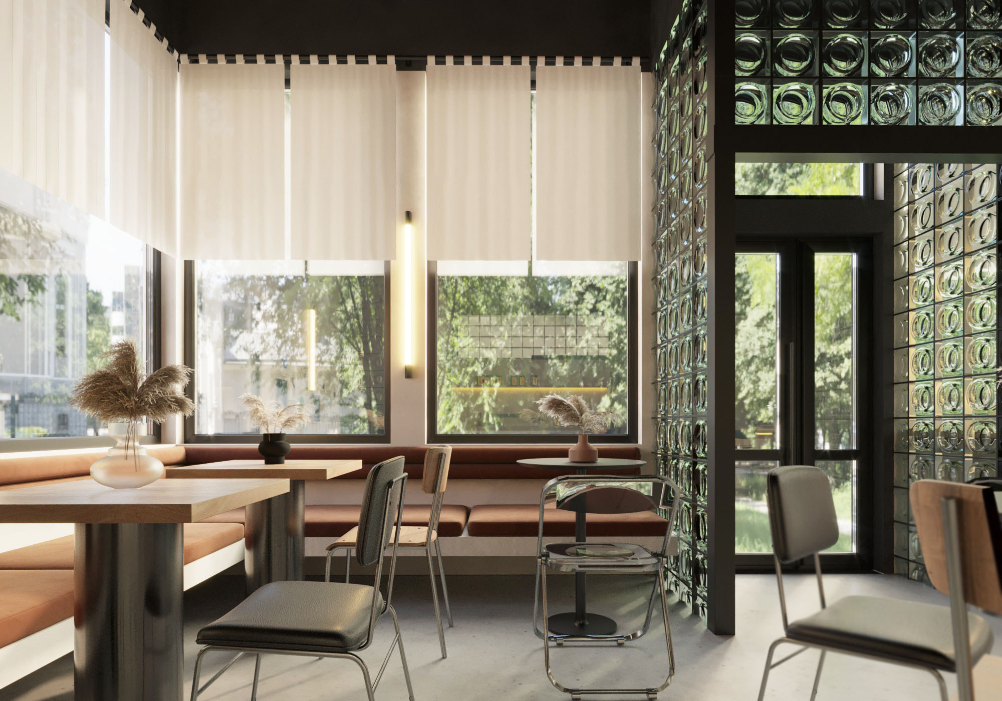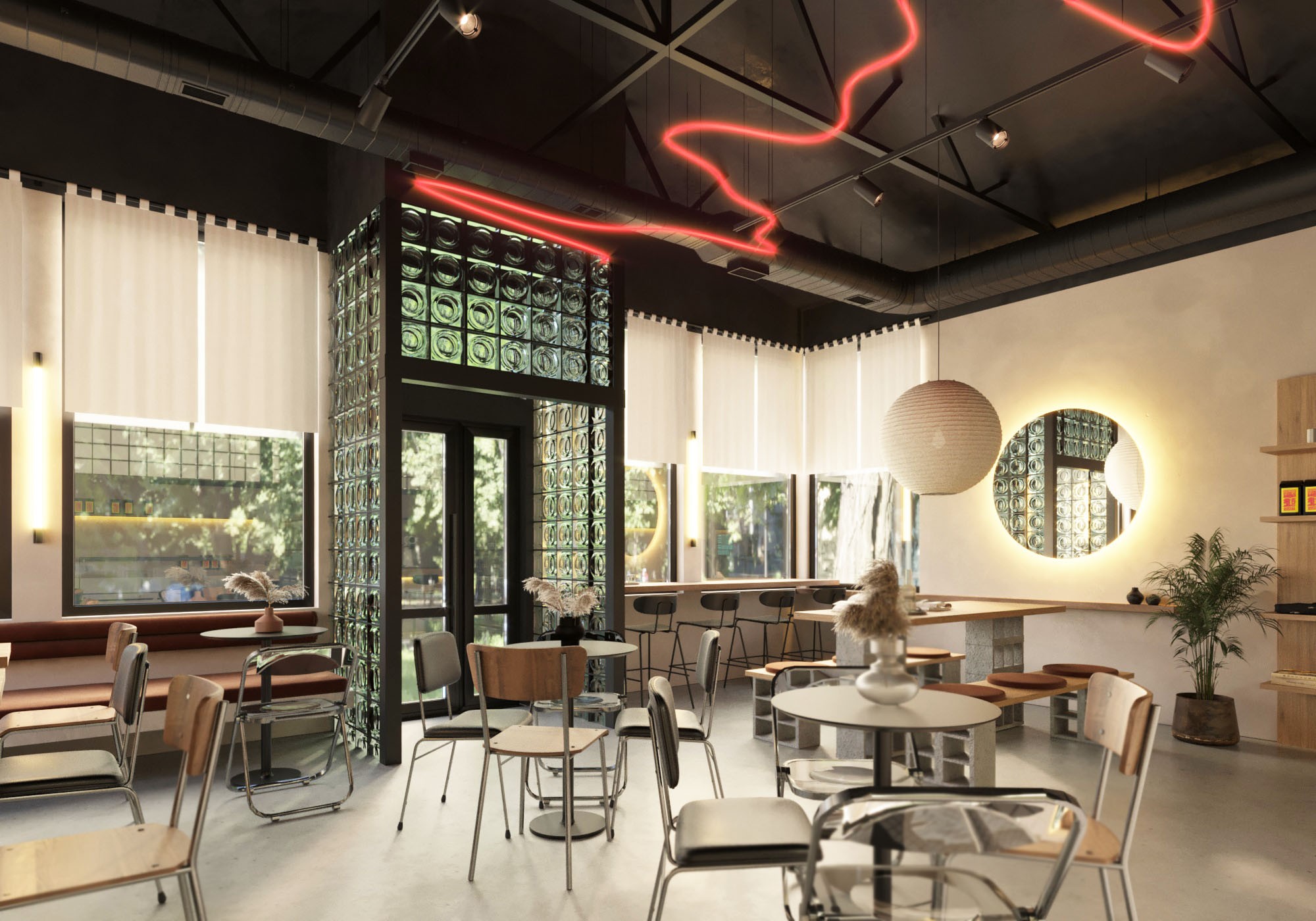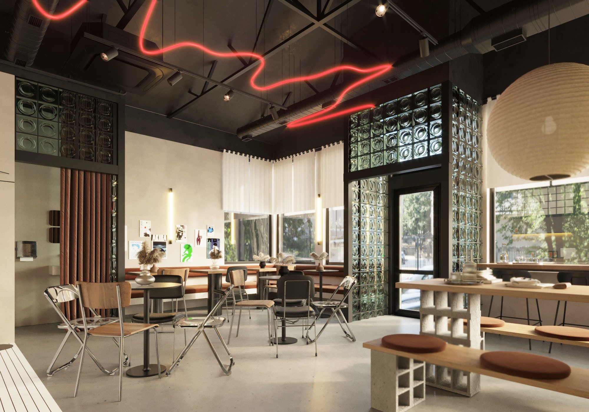 The interior details also had a reference to the name "on fire", so the interior features red color in the form of lighting and accent fabric. The LED chandelier is made in an abstract form that resembles a stream of spreading lava. At the same time, it was decided to leave the walls and floor neutral in order to reduce visual noise, because the area where the coffee shop is located is characterized by many self-built buildings and an excessive amount of advertising and signage, that do not have a consistent style.