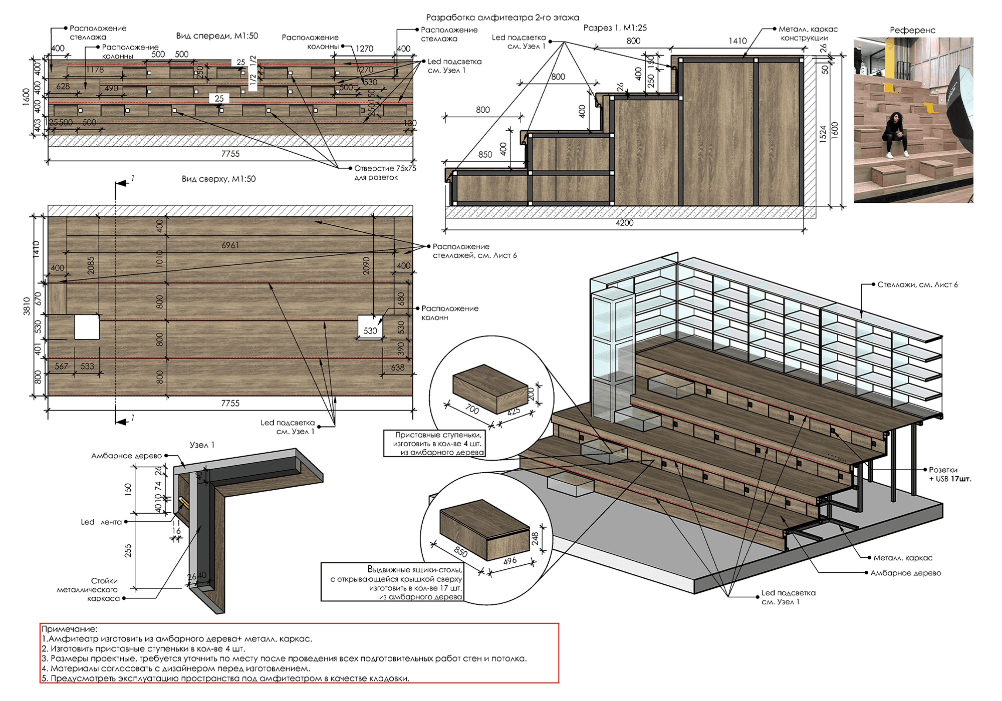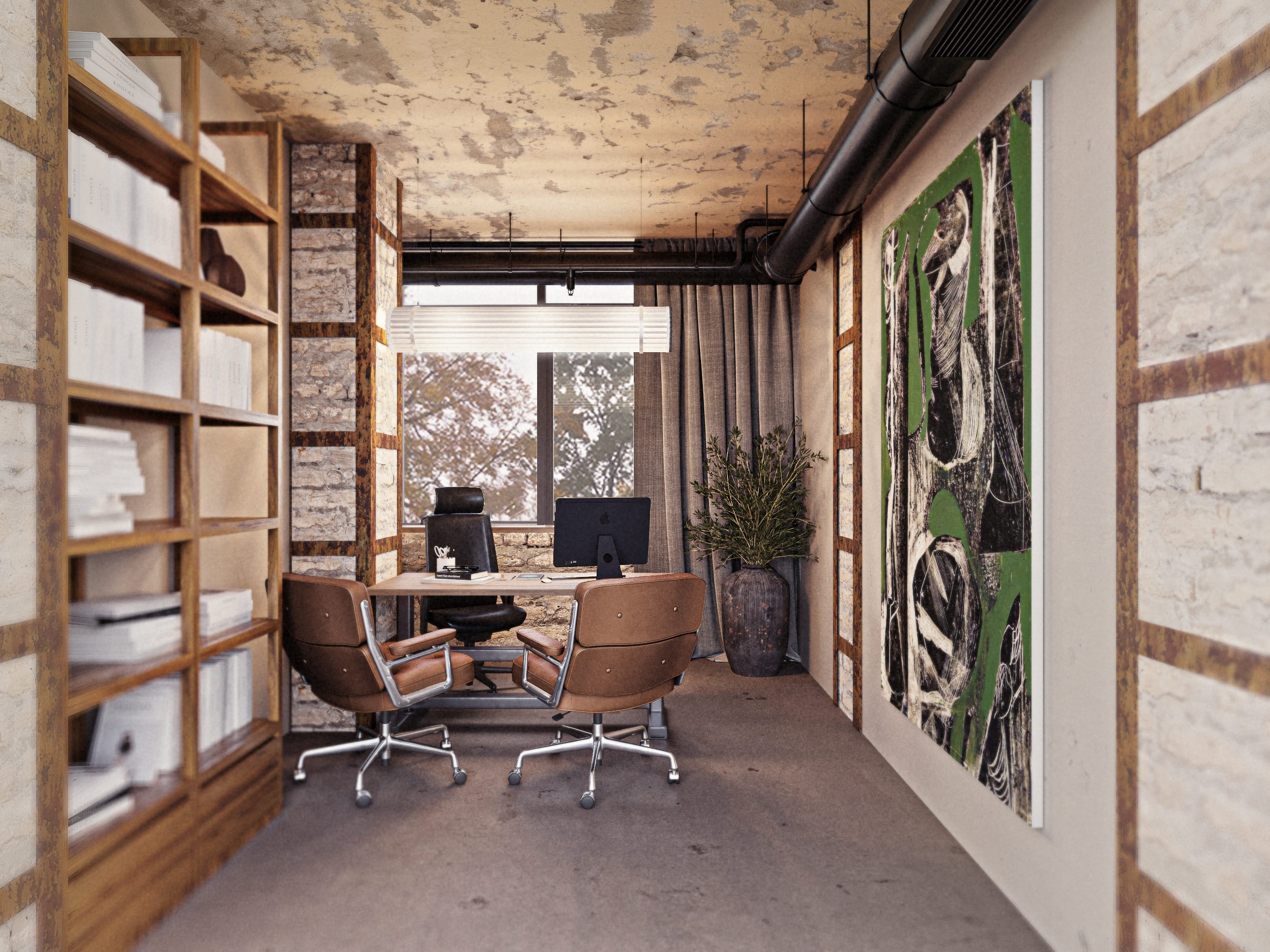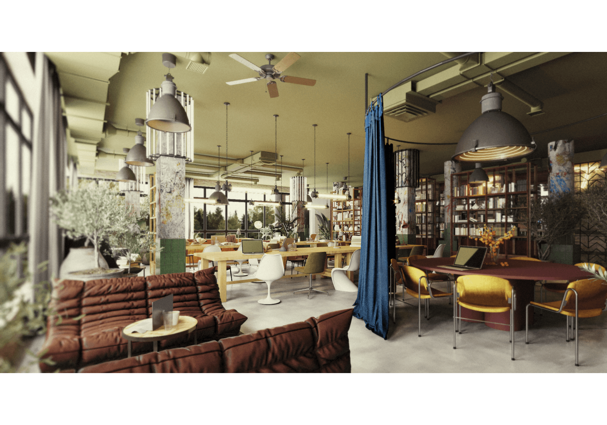 The coworking space has different zones, more open for socializing and, conversely, more intimate for calming down. For this project, I developed almost all the drawings of furniture, decorative details, partitions, plans, and partially participated in the equipment and design development.