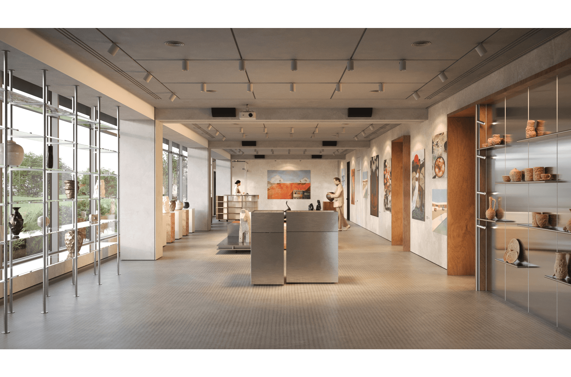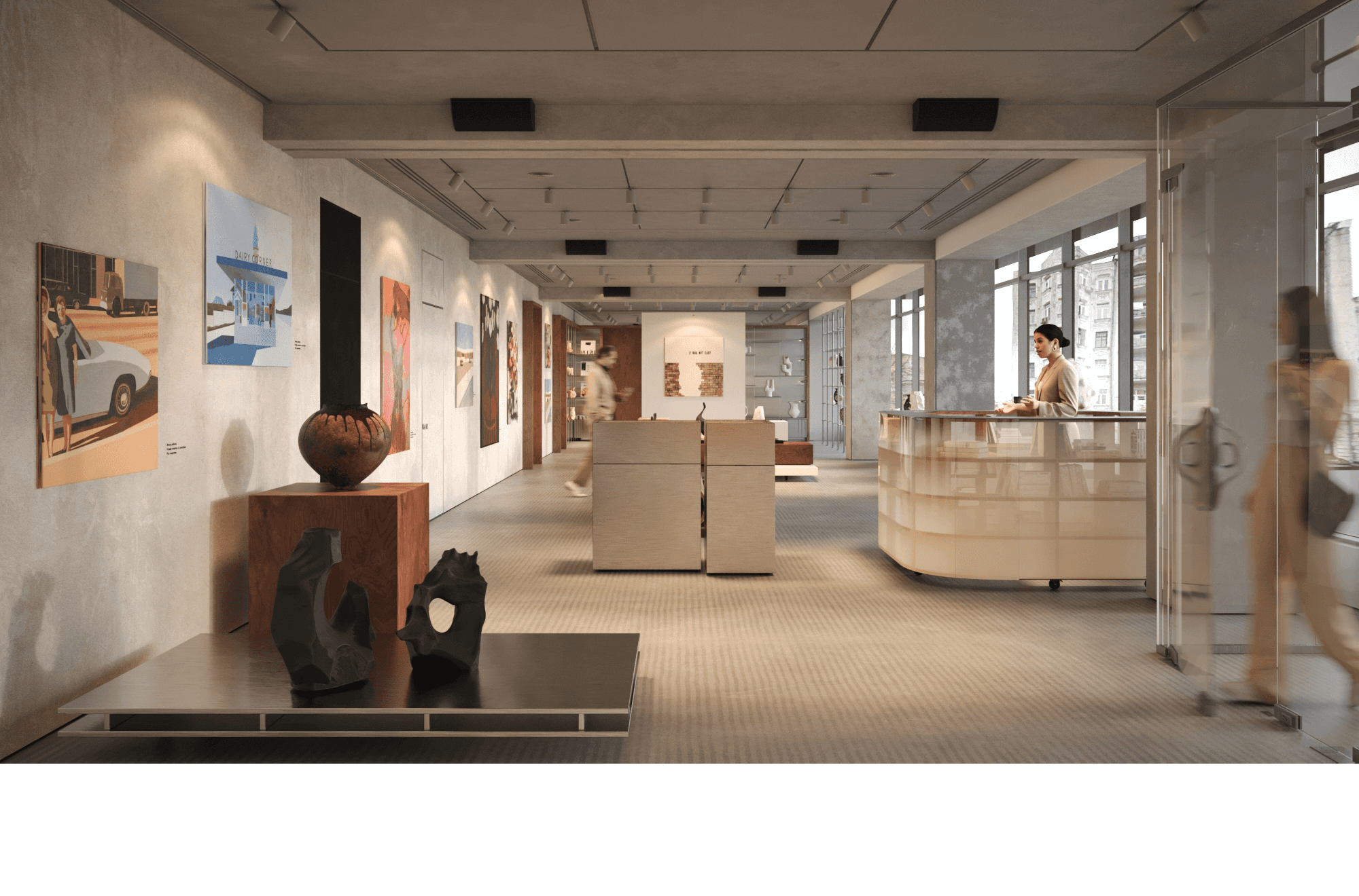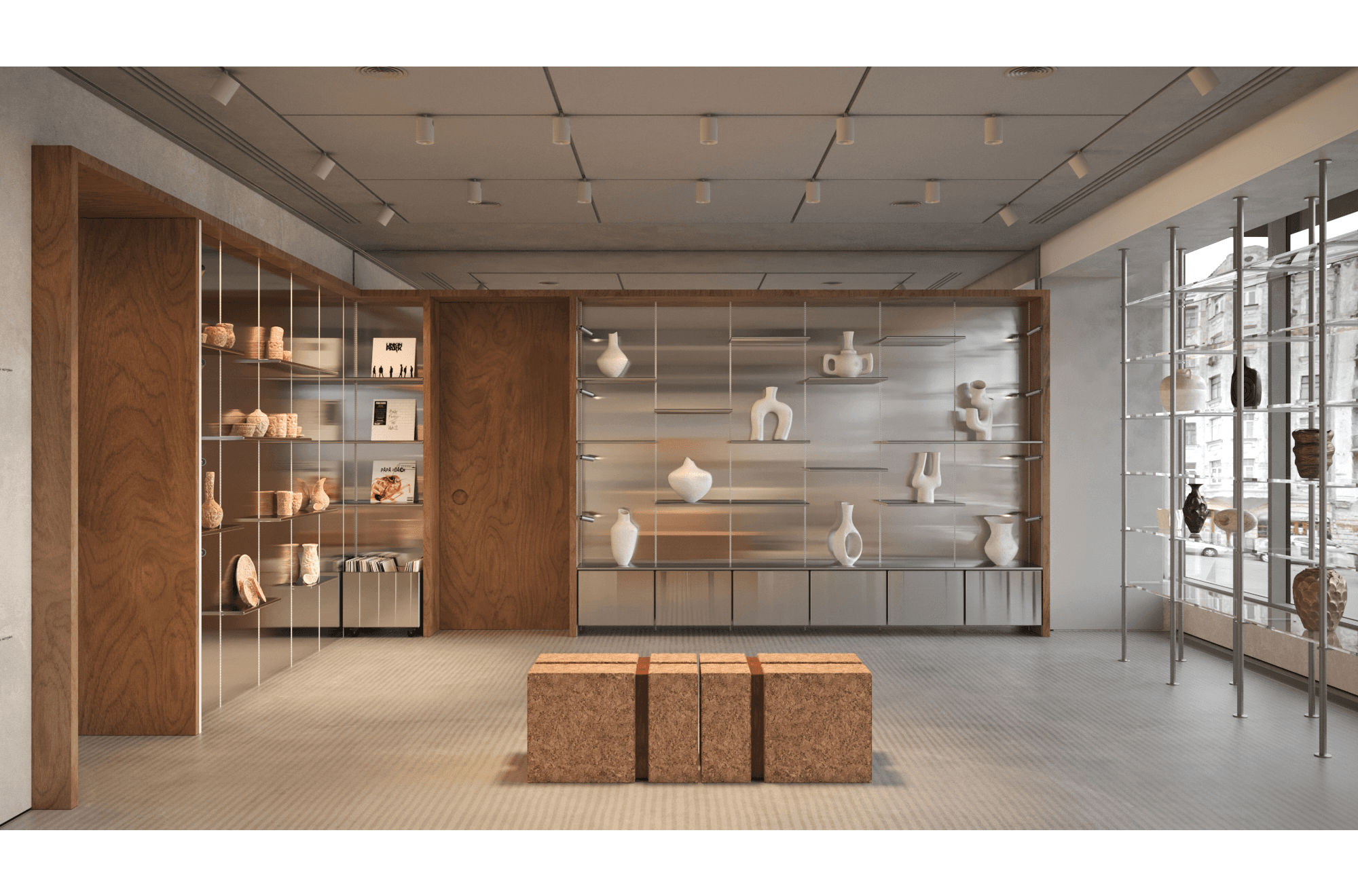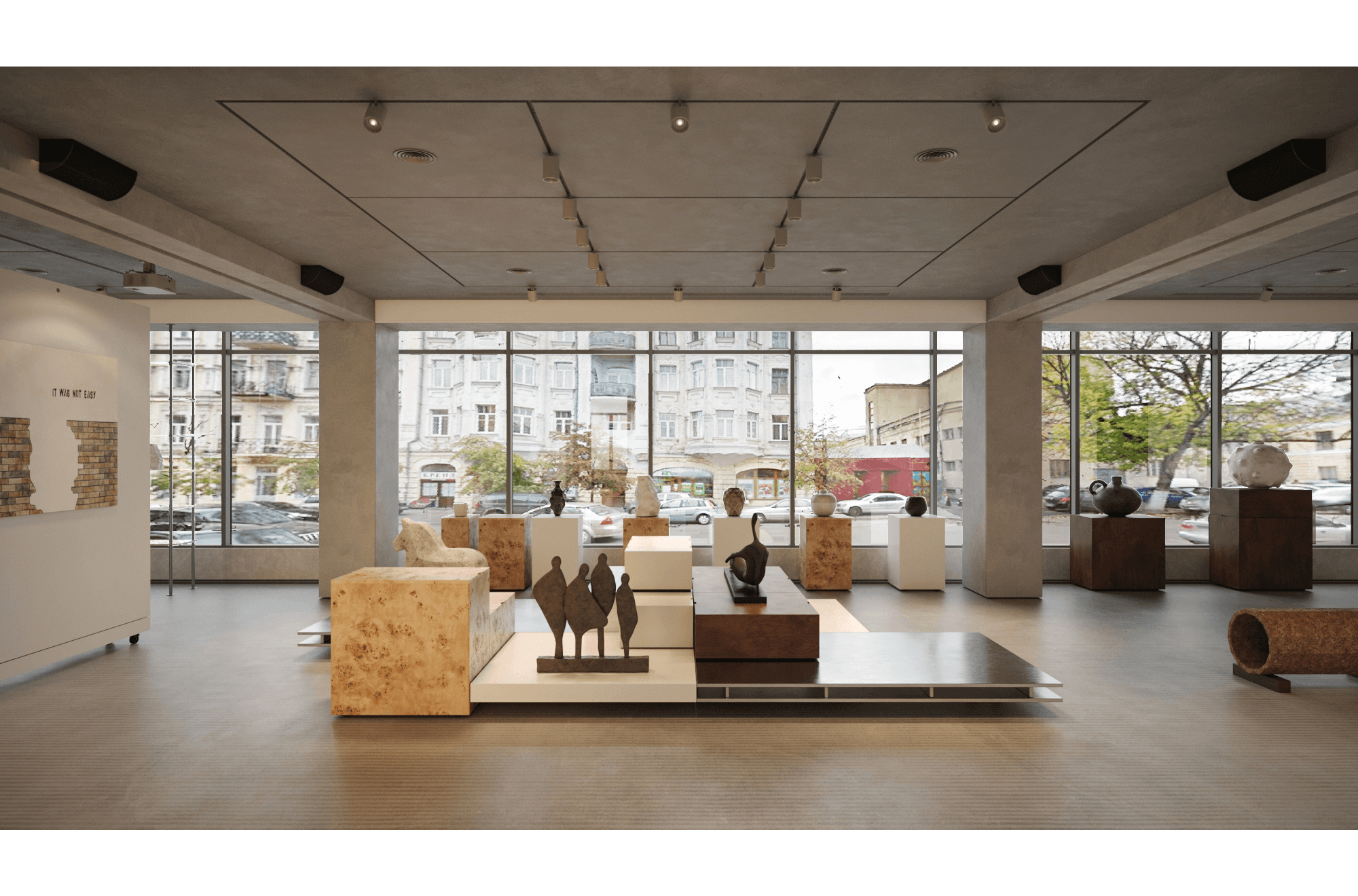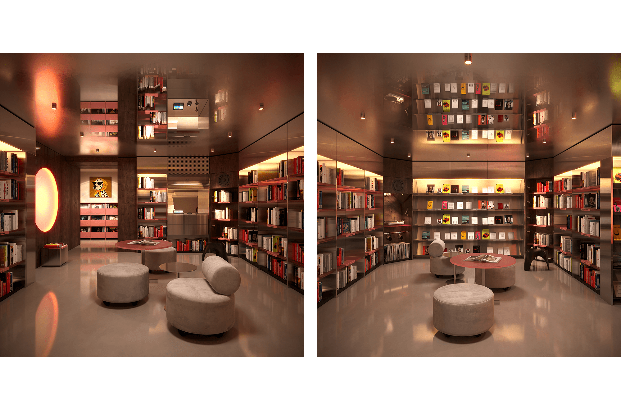 The spatial layout and visual design of this multifunctional space in Kyiv - which includes an art shop, a gallery, a café, a bar, a bookstore, and a vinyl shop - were carefully planned. The conceptual vision for the space’s design was developed in collaboration with the studio’s team.
