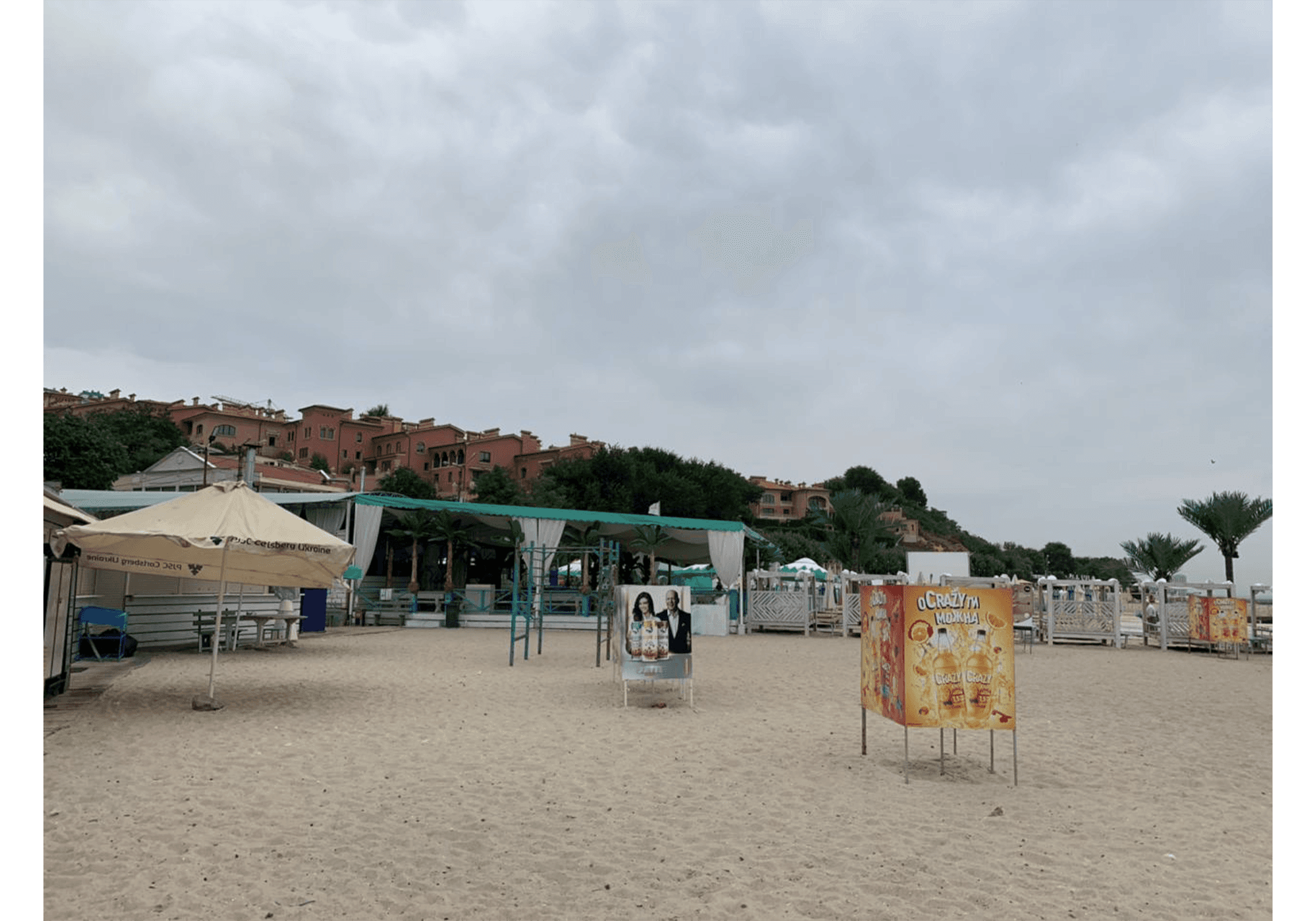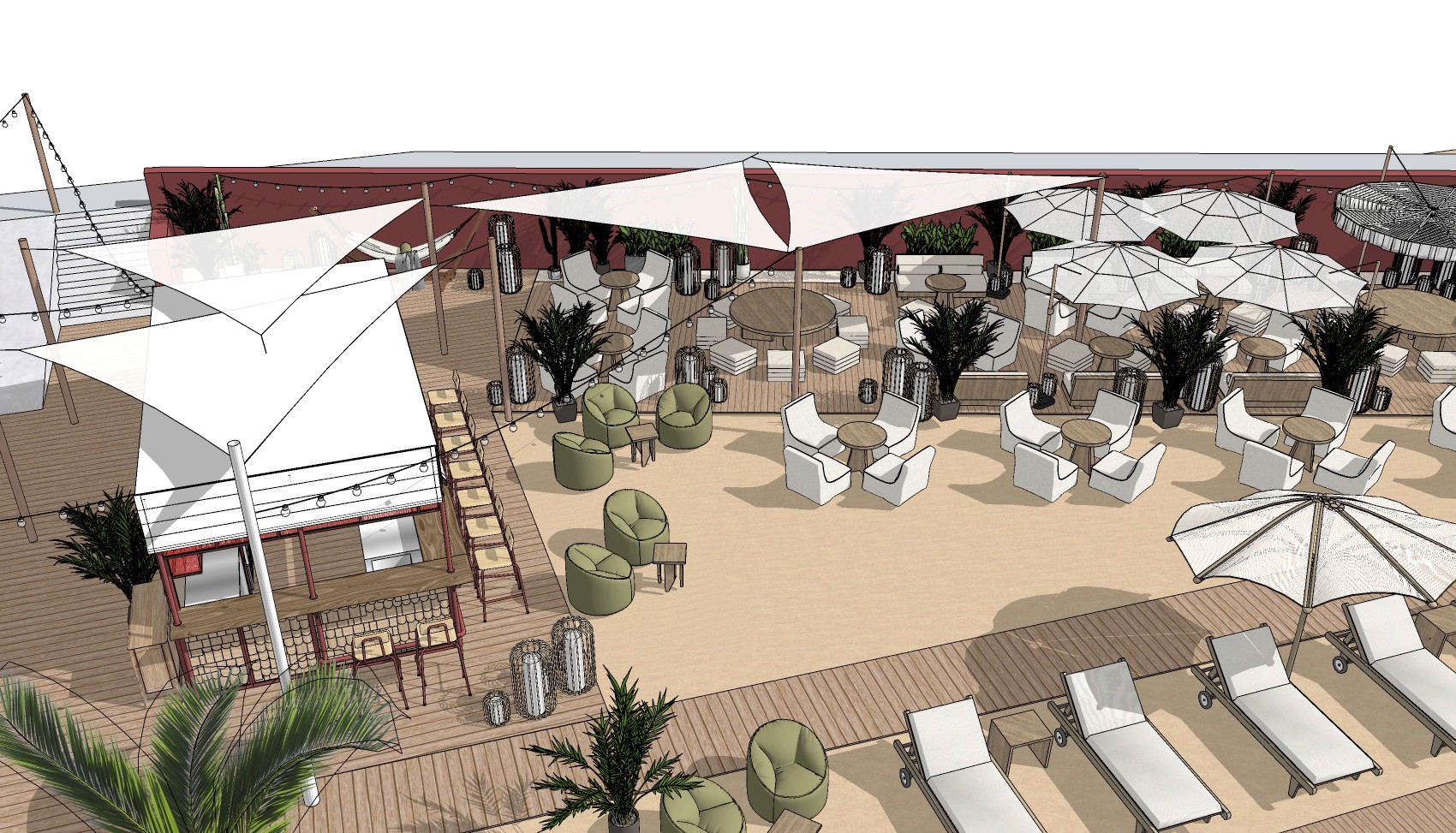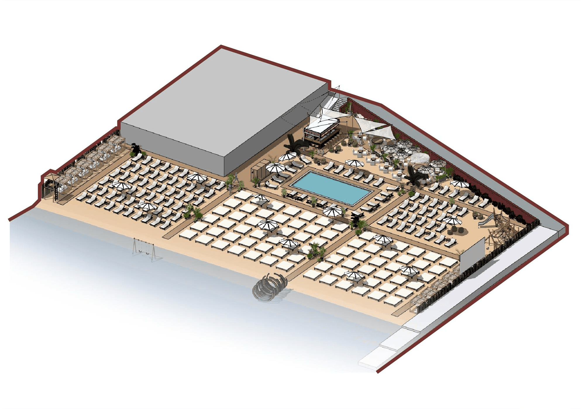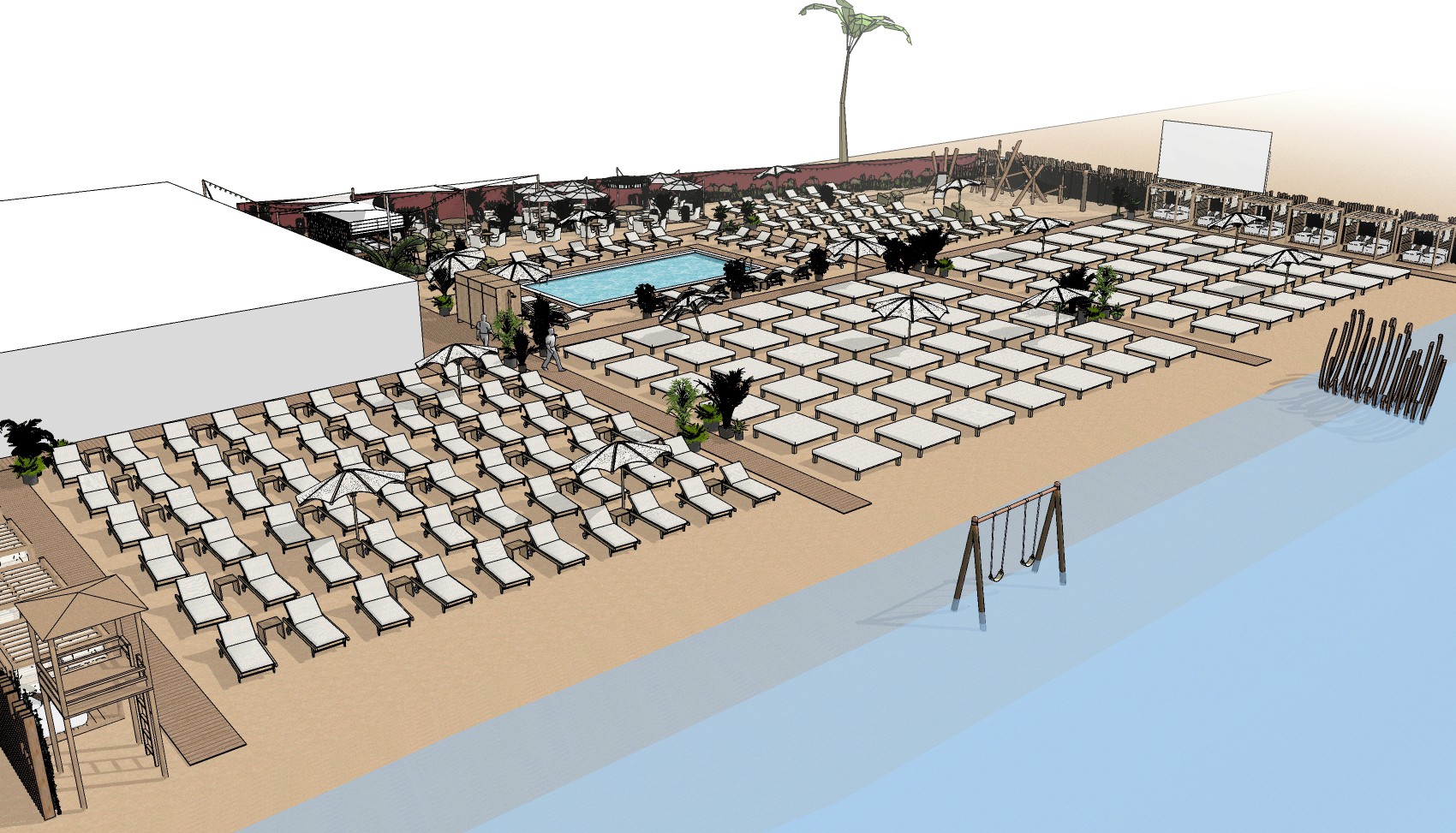 The task was to develop a beach layout with several zones: a high-comfort zone with a swimming pool, a restaurant zone, a bar zone, a playground, photo zones and a large zone with standard sunbeds. The space had to provide for summer cinema events, so we proposed to place a large screen in the center of one side of the territory.
