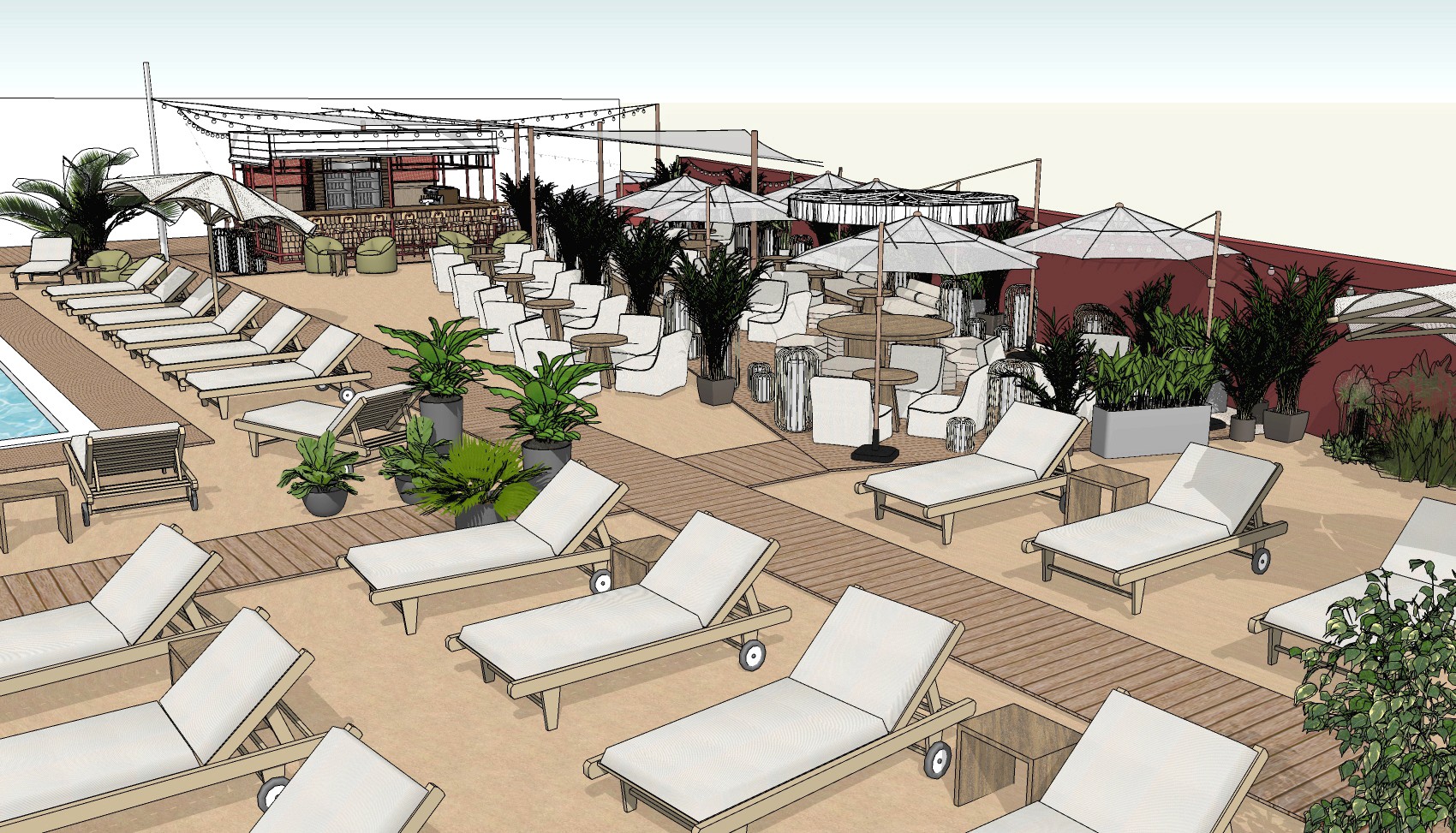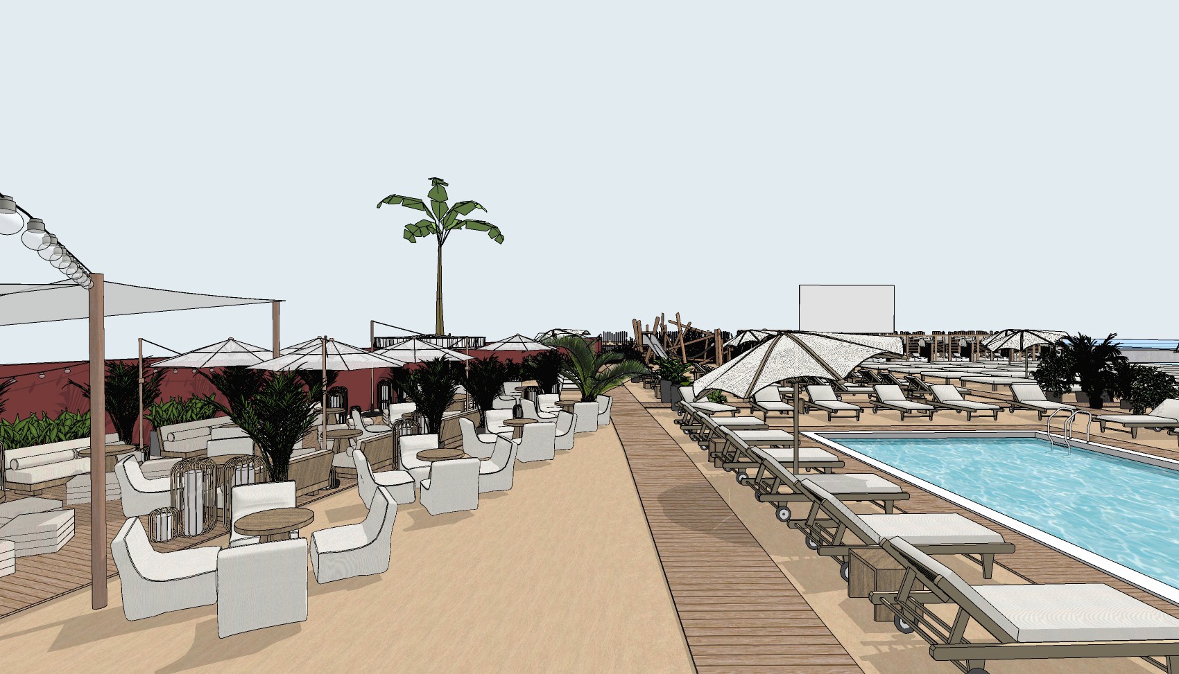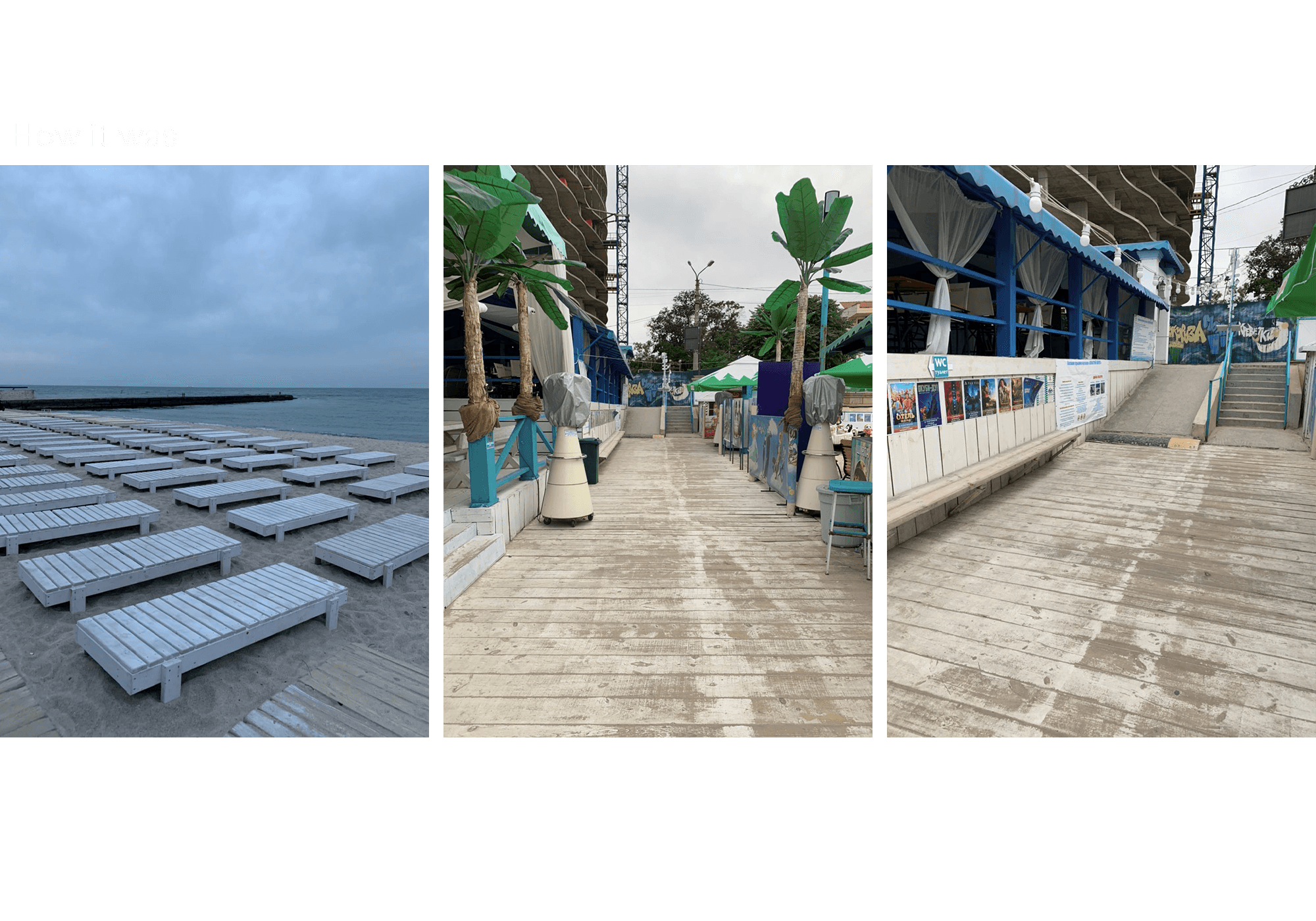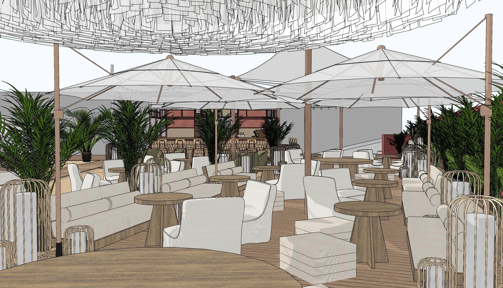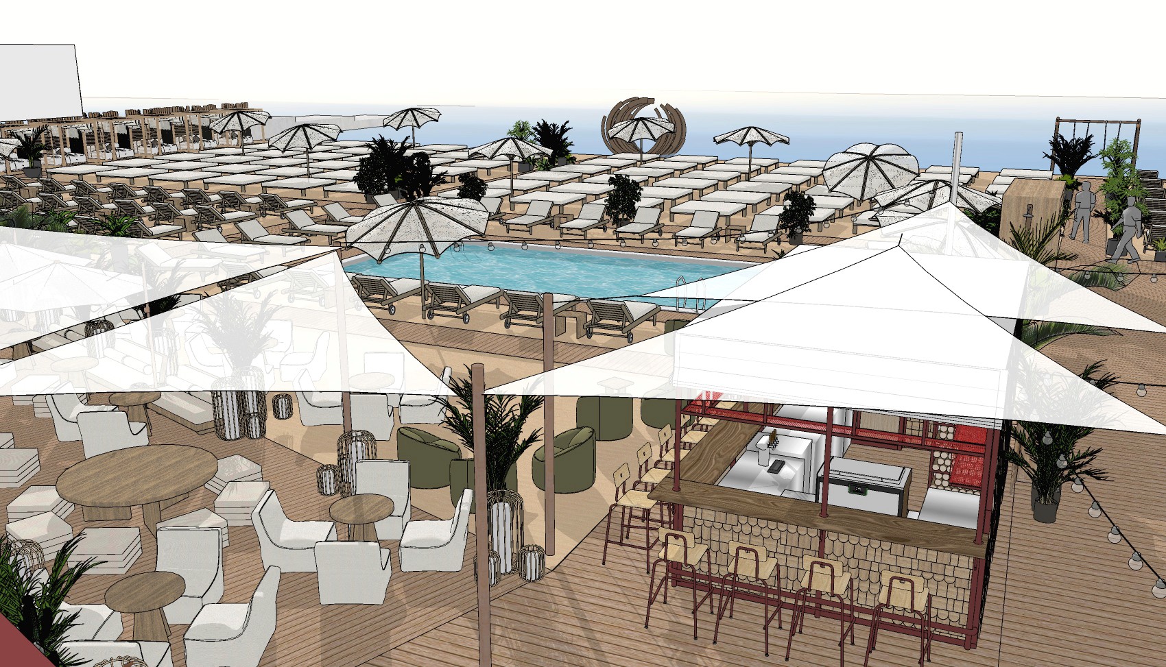 The task was to develop a beach layout with several zones: a high-comfort zone with a swimming pool, a restaurant zone, a bar zone, a playground, photo zones and a large zone with standard sunbeds. The space had to provide for summer cinema events, so we proposed to place a large screen in the center of one side of the territory.