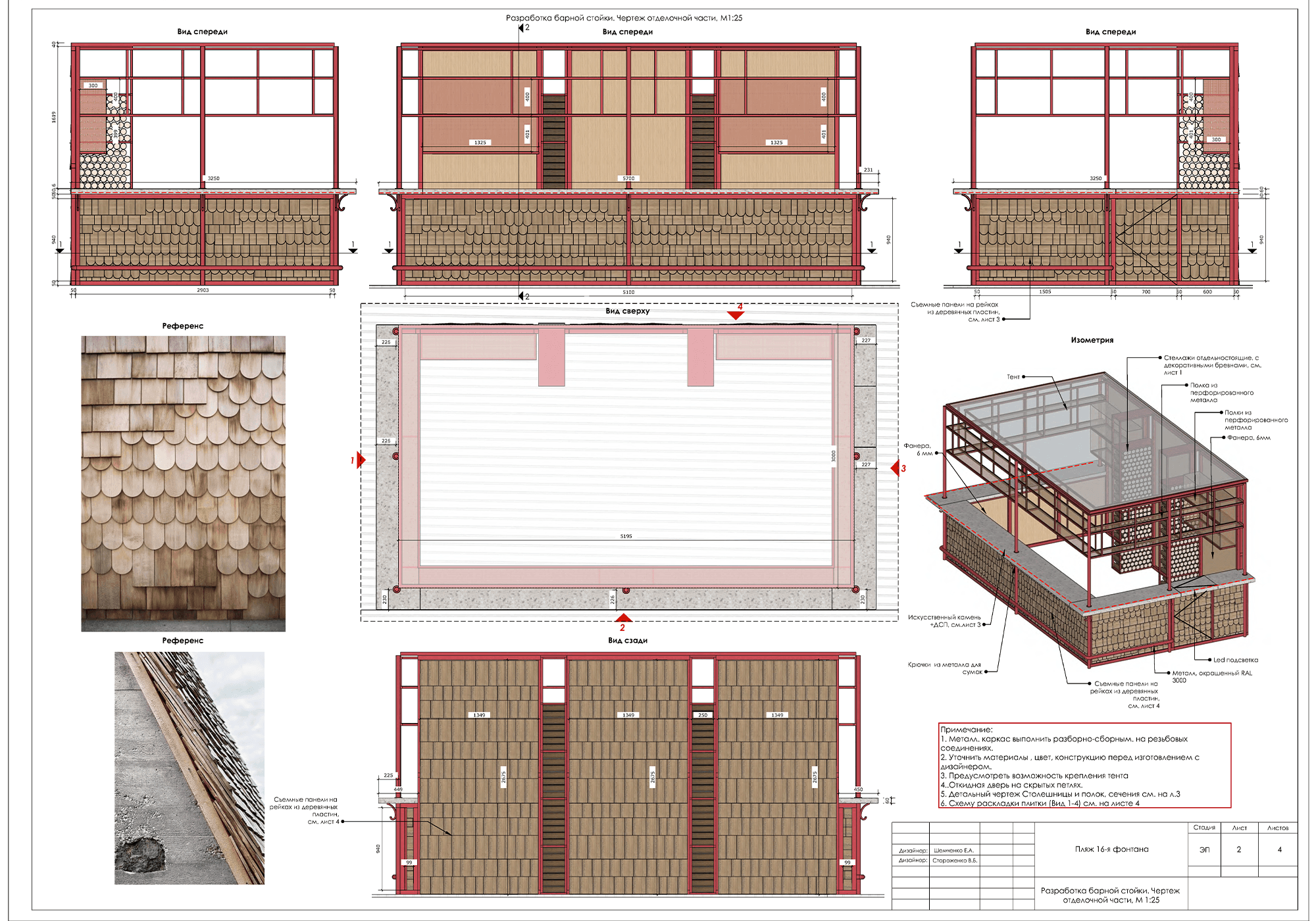 It was also very important to make the bar structure completely collapsible, and the client insisted on using wooden firewood in the partitions between the zones in the bar as a decorative element. We designed a collapsible metal frame of the bar and removable panels of wood and metal on rails as a decoration - and covered the structure with a tent on fasteners.